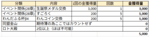 30日のうち8回金200が登場し、そのうちの6回を入手できると仮定。1カ月で6回、1期(6か月)で36回獲得できると計算しました。