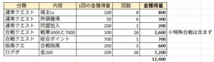 クエストで獲得できる金をまとめたのがこちら↓です。