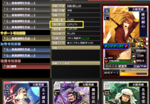 火焔武闘と天穿奏覇は発動上限が2なので、倍枠の志々雄(2倍)・早雲(2.5倍)のみ発動している計算です。