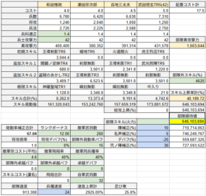 今川部隊の火焔武闘が一つ通常枠だと△3.5億、剣心部隊の早雲の火焔武闘が通常枠だと△3.3億(天穿で△2.3億)、志々雄だと△5億(天穿で△3.4億)で140億からこのうちの3つマイナスで大体130億。