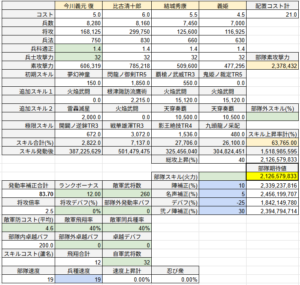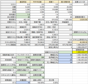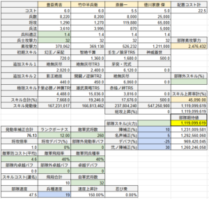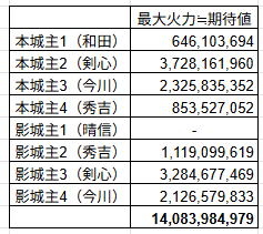 (ちなみに、秀吉部隊を焙烙火矢にした場合は145億を越えてしまいます。剣心・今川部隊も焙烙火矢にするとさらに高くなります)