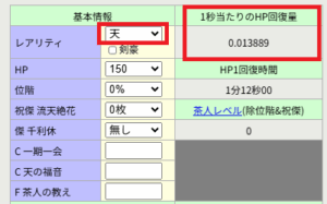 600秒当たりの回復量は天の場合8.33となります(計算に使った極の場合は9.6)。