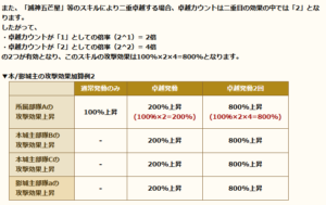 挙動はヴァリニャーノのスキルと同じと思われるので、倍枠などに移植しても最大効果は2500%のまま。