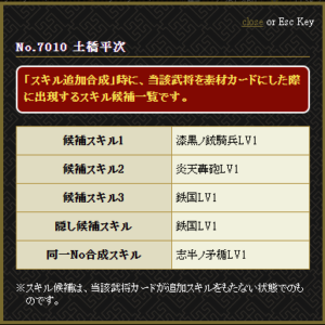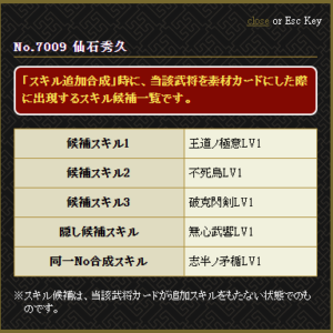馬対応で速度70%上昇は悪くない。素材としては速度スキル3面待ち。候補1の「虎嗣敢闘」はAレアスキルの素材になるので天下の片鱗化も一応可能。