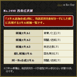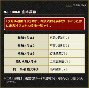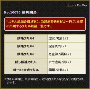 素材としては、初期スキルの他、極 佐々さんの「漆黒ノ銃騎兵」(自軍帰還速度3倍)、プラチナ大友義鎮さんの「炎天轟砲」(自合流時名声消費20減) が狙えます。